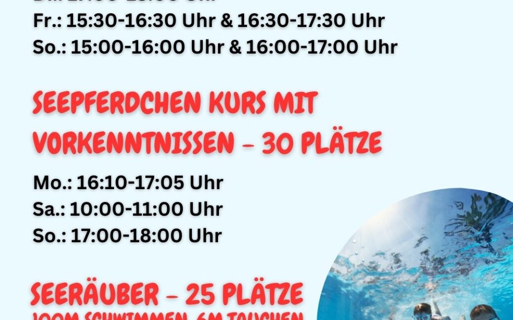 Nichtschwimmerkurse für Kinder ab 6 JahrenAb dem 09. Januar starten unsere neuen Nichtschwimmerkurse im Hallenbad Niefern. Seepferdchen Kurs – 40 Plätze Mo.: 15:15 -16:10 Uhr Di.: 17:00-18:00 Uhr Fr.: 15:30-16:30 Uhr & 16:30-17:30 Uhr So.: 15:00-16:00 Uhr & 16:00-17:00 Uhr Seepferdchen Kurs mit Vorkenntnissen – 30 Plätze Mo.: 16:10-17:05 Uhr Sa.: 10:00-11:00 Uhr So.: 17:00-18:00 […]